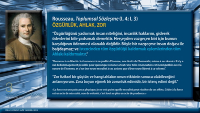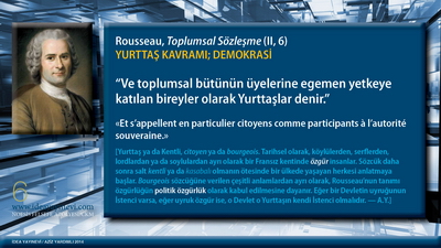 [Yasasız, denetimsiz, dilediğini yapan değil ama Yasasında kendi istencini bulan halk özgürdür. Özgürlük Yurttaşın karakteridir. Özgürlük özencin, keyfi istencin, dürtünün, alışkanlığın, eğilimin, itkinin, hırsın, tutkunun, giderek içgüdünün vb. değil ama İstencin belirlenimidir. Birinciler kendilerinde kötü değildirler. Ama ussal istence, özgür duyunca, evrensel usa aykırı iseler sonsuz kötülüklerin nedeni olabilirler. Özgür halklar yasalarında kendi özgürlüklerine boyun eğerler; despotik halklar ancak dışsal istence, ancak güce boyun eğmeyi bilir ve şiddet, zulüm, korku, utanç, yoksulluk, ahlaksızlık içinde yaşarlar. — A.Y.] • |