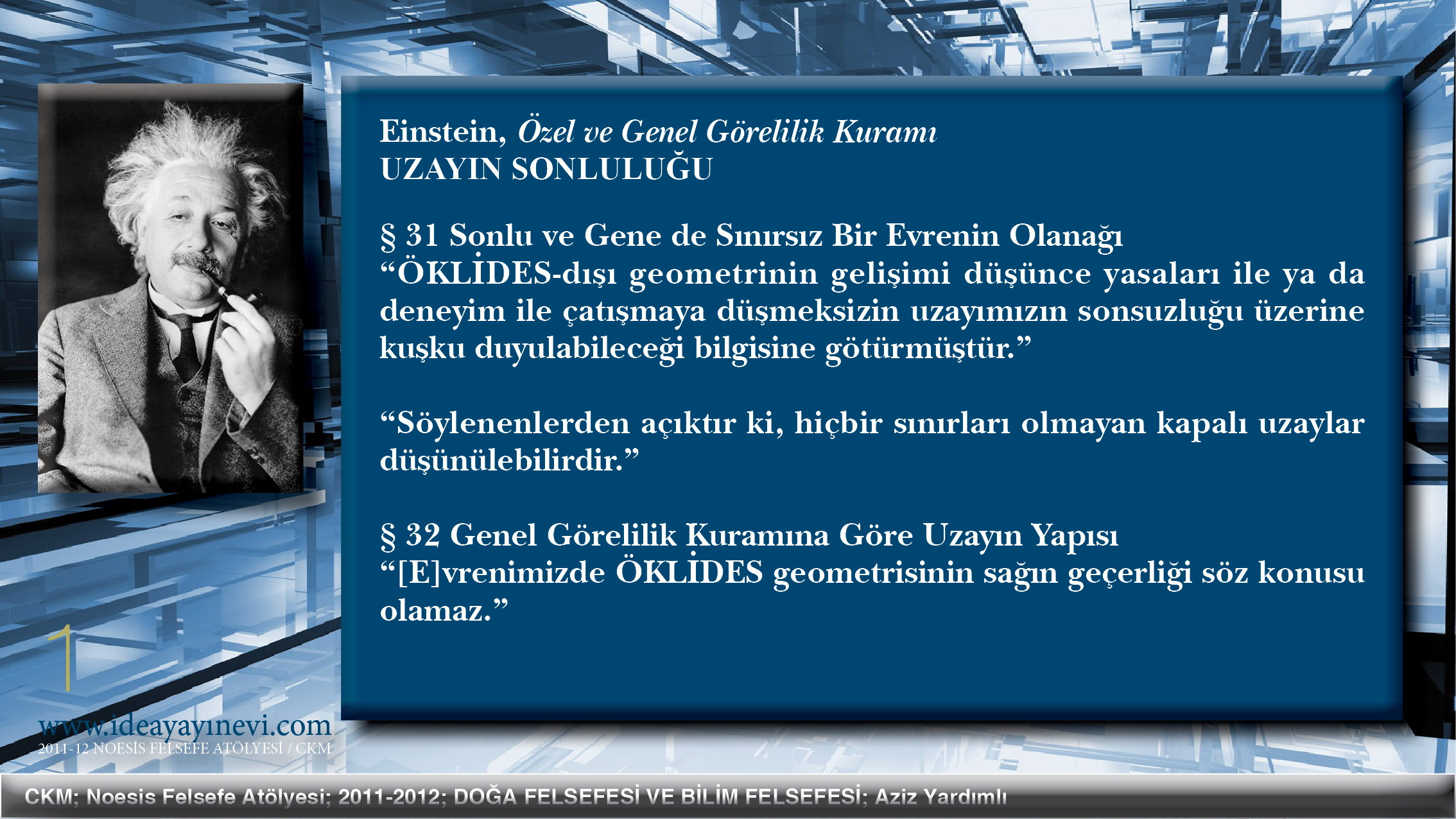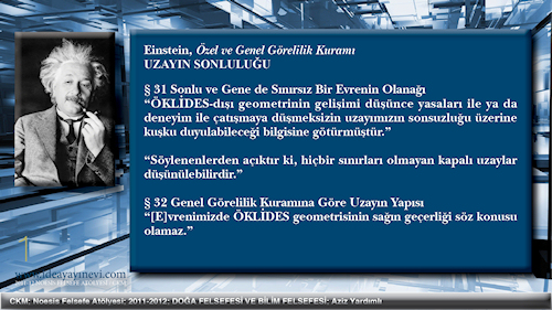 | Einstein (ya da başka herhangi biri, çünkü burada düşüncenin kendisi önemlidir, kimin düşündüğü değil) Uzayı sonlu olarak gördü. Bu usdışıdır, ve insan usu kendini yadsıma, bozma yeteneğini taşır, ve Uzay Einstein'ın bilincinde sonlu olabilir. Einstein tüm görgücü-olgucu felsefi temellerine karşın, ve başka her görgücü-olgucu gibi, normal bir insan gibi düşünmeksizin de yapamadı. Kavramlarının tüm öznelliğine karşın onların Realite ile, olgusal dünya ile bağıntılarını reddetmedi. | Uzay, zaman, özdek, kütle, devim — bu kavramlar ve Doğanın daha başka kavramları birdir. Ancak analitik düşünce onları ayırabilir, çözebilir, saltıklaştırabilir, çünkü saltık olmak ilişkisiz olmak, göreli olmamaktır. | Einstein'ın "Uzay-zaman" dediği tasarım Uzayın ve Zamanın dışsal olarak bir araya getirilmesidir. Her Uzay noktasının göreli üç boyutu vardır, der Einstein. Ve her Uzay noktasının belli başka bir nokta ile göreli kendi tikel t1 zamanı vardır, der. Böylece her uzay noktası başka her uzay noktası ile göreli olarak x1, y1, z1 ve son olarak t1 koordinatları ile tanımlanır. Bu onun düşüncesinde Uzayı ve Zamanı birleştirme ve Zamanın sürekliliğini, Eşzamanlılığı çürütme yoludur. Einstein yalnızca görgül zamana izin verir, çünkü Kavramları Olimpos'un doruklarından yeryüzüne indirmiştir. 'Evrensel Şimdi'yi saltık olarak görür ve reddeder. Eşzamanlılık görgül değildir, öyleyse saltıktır, ve öyleyse reddedilmelidir. | ||||||