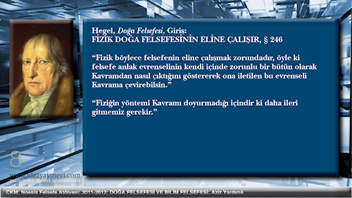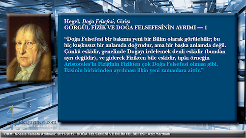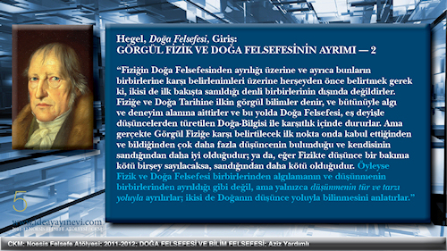 Bilim Felsefesi = Doğa ve Tin Bilimlerinin Felsefesi Bilim Felsefesi başlığındaki 'bilim' sözcüğü görgül-pozitif bilimler olarak okunmalıdır. O zaman aralarında herhangi bir ayrım yapmaksızın görgül Doğa Bilimlerini ve görgül Tin Bilimlerini kapsar. Bu ilişkilendirme Hegel'in Ansiklopedisi'ndeki Doğa ve Tin Felsefeleri bölümlerini kapsarken, Mantık Bilimi'ni dışarıda bırakır. Bilim Felsefesi henüz Doğa ve Tin alanlarının Kavramlarının bir çözümlemesi ile ilgilenmez. Bunun için Kavramın doğasının kendisini kavramasının gerektiğinin bilincinde değildir. |