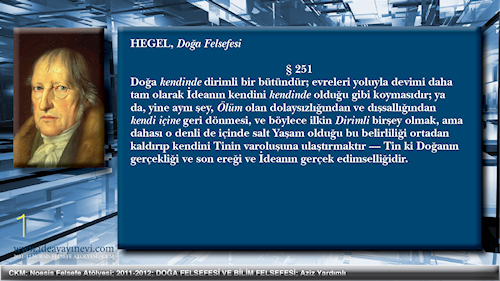 Doğa, Ereksellik, Gelişim Tin Doğadan doğar; ama Doğanın kendisinin doğması, varlığını kendisinde taşımaması, tersine bir oluş süreci olması Doğayı yaratıcı olarak görmemizi, natüralizmi ya da panteizmi doğrulamamızı önler. Doğa belirleniminin kendisi Tin ile karşıtlık içinde olanaklıdır ve Tin olmaksızın Doğanın ne olduğunu söylemek olanaksızdır. . |