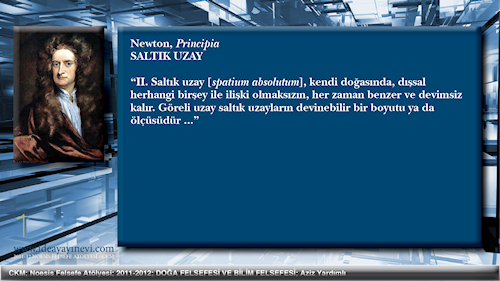 | Saltık Uzay geometrik uzay ya da geometrinin uzayıdır. Saltık Uzay göreli, e.d. ilişkili olmamalıdır çünkü saltıktır, e.d. soyuttur. Zaman ile, özdek ile, devim ile, bütününde herhangibir şey ile ilişkili olmamalıdır, çünkü göreli olanın karşıtıdır. Böyle olarak Saltık Uzay ancak düşünülebilen birşey, bir Gedankenexperimenttir. | Uzay Zamandan ve Özdekten ayrı olarak ussal, e.d. edimsel değildir. Uzayın Zaman ile birliği Einstein'ın görelilik kuramında olduğu gibi ikisinin bir boyutlar toplamı olarak yanyana gelmesi değildir. Uzayın Zamanı kendisinden ayrı bir nesne olarak içine alması da söz konusu olamaz. Uzay ve Zaman iki ayrı şey olarak birdir ve ancak soyutlamacı analitik düşünce onları ayırabilir. Bu birlik Özdeğin kendisidir. Özdek Devimi ancak mantıksal olarak önceleyebilir. | Uzay arı nicelik olduğu düzeye dek nicelleştirilebilir. Nicelik kavramının realite ile ilişkisi, e.d. belirlilik kazanması kavramın kendi diyalektiğinde yatar. Kavram saltık ya da soyuttur. Ama tam bu belirlenimsizliği belirliliği olumsuzlaması ve böylece ilişkili, belirli olmasıdır. | ||||||