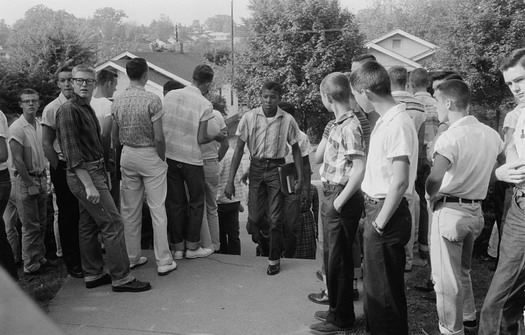 4 Aralık 1956 Okullarda ayrımcılığın ortadan kaldırılmasına bağlı bir şiddet dönemi sırasında bir zenci öğrenicinin bir beyaz öğrenciler kalabalığı içinden yürüyüşü. (Büyük boy; kaynak: The Library of Congress; PPOC.) |