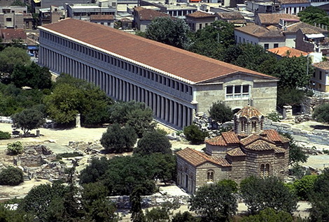 | Stoa (Sundurma) eski Yunanistan’da yaygın bir yapı tipiydi. Bunlar bir çatıyı destekleyen iki sütunlar dizisinden ve bir yan duvardan oluşurdu. Yazın sıcağından ve kışın soğuk rüzgarlarından kaçınmak isteyenler için gezinti sığınakları olarak hizmet ederlerdi. Birer alış veriş özeği olan bu yapılarda aynı zamanda Türe işleri de görülürdü. |