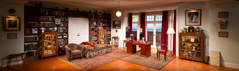 Kitaplık ve çalışma odası Freud’un ölümünden sonra Anna tarafından olduğu gibi saklandı. Freud’un arkasındaki masada Goethe’nin yanısıra Heine, Multatuli ve Anatole France gibi en sevdiği yazarların kitapları da bulunur. | |