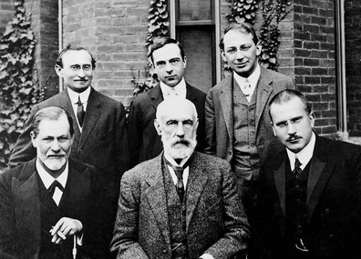 ![]() Clark Üniversitesi önünde küme fotoğrafı: Sigmund Freud, Stanley Hall, C.G. Jung; arka sıra: Abraham A. Brill, Ernest Jones, Sandor Ferenczi |